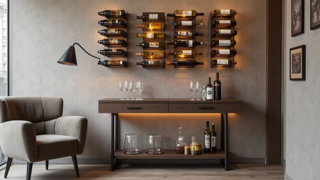 - Use wall-mounted racks, floating shelves, and glass-front cabinets to showcase wine collections while maximizing limited floor space.