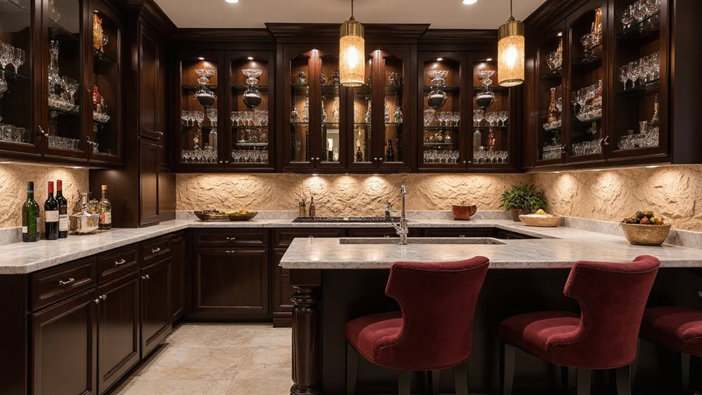 - Under-cabinet LED strips that cast warm light across your bar countertop